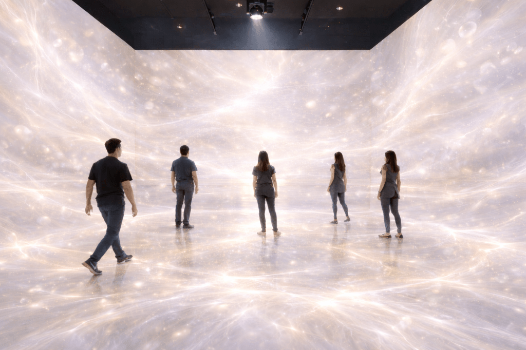 The main inspirations for our team, and for me personally, were teamLab and AYA Universe. I loved how sound and light created an environment where you just forget everything else. I wanted to recreate that same feeling in our project. At the same time, we decided to use text as one of the main elements to give the experience greater meaning. We wanted people to work through their emotions and reach a state of inner peace and a deeper connection with themselves. So I created a text that will guide the participant and will feel poetic and subtle.