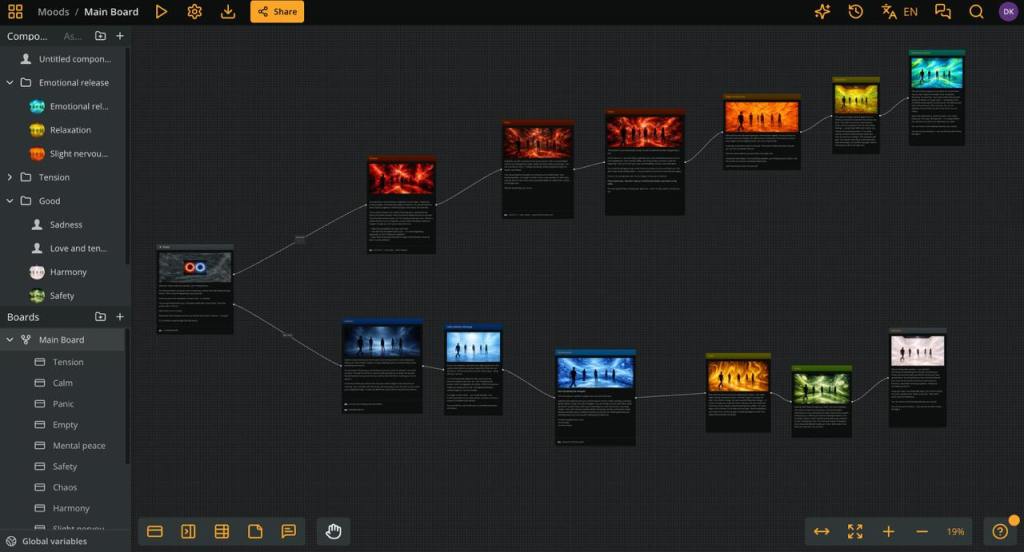 To better understand and organize the narrative, I created a visual novel in Arcweave. This helped me to map out the branching paths and helped me to understand how the emotions should be connected to each other to create an interesting experience, because it is important to visualize the transition between emotional states and projections. In addition, I created a sensory atmosphere of the project. I selected the music that can support the emotional flow of the experience and can help the participant feel and immerse the atmosphere more deeply. I also generated the images to show the project coordinator and the technical specialist how I imaged the projections. Based on the generated pictures, they created a final installation. Later, I created two scripts for concept creator, so she could read text in a way that was comfortable for her. Overall, Arcweave helped me to turn our abstract idea into a structured interactive narrative and helped to connect visuals with the project’s conceptual meaning.
